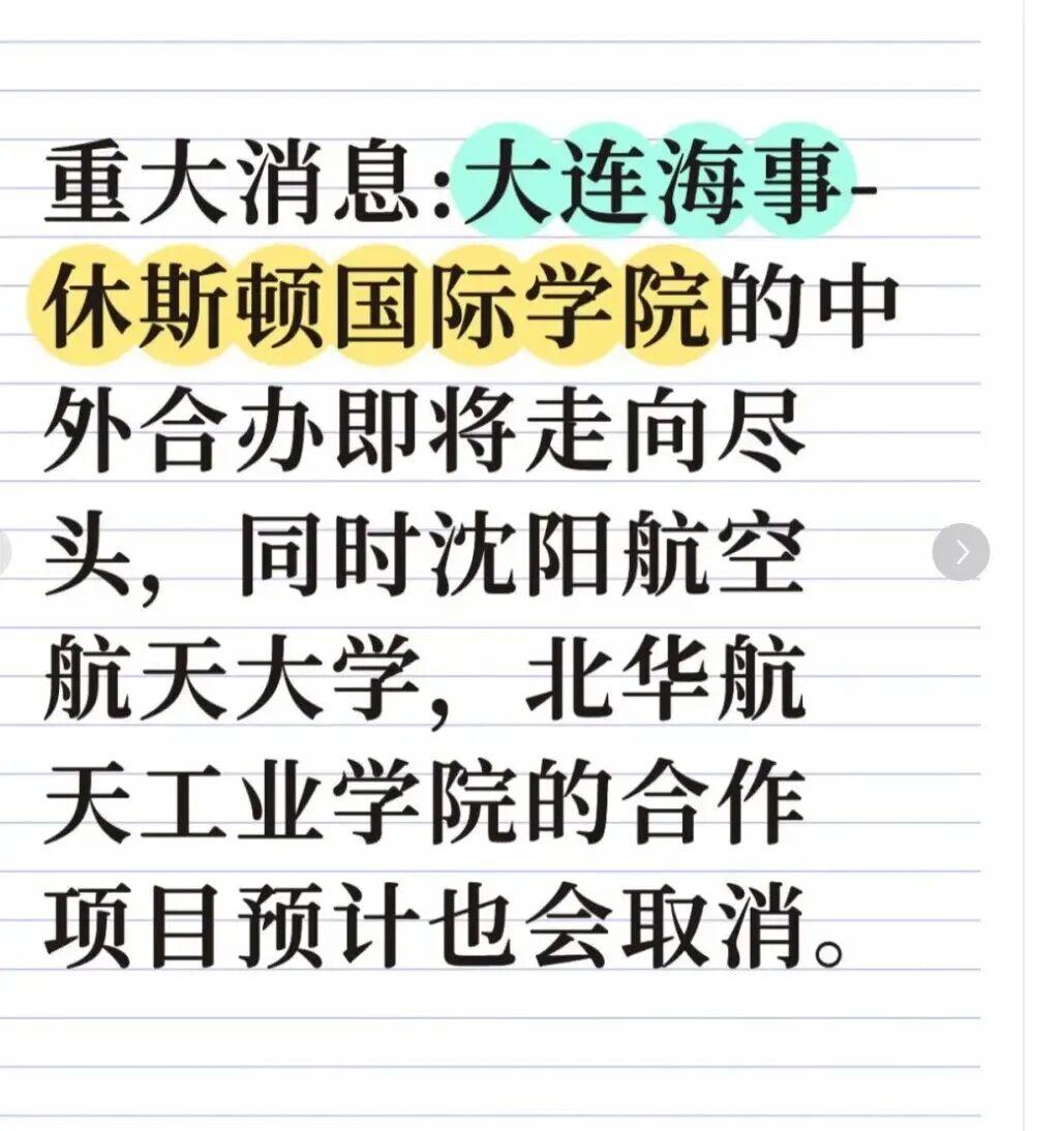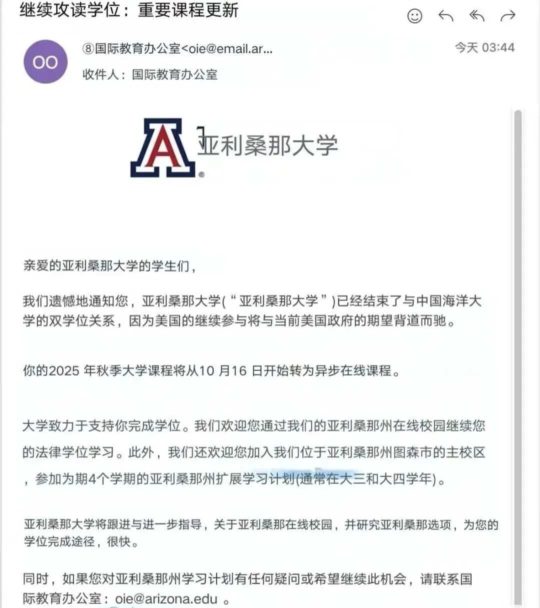 河北工业大学:与UA合办的“亚利桑那工业学院”,据称学校正与美方沟通,但未来不明。 西北农林科技大学:有学生在微信群里转发通知,称UA单方面停止合作。 郑州西亚斯学院:有媒体在相关报道中提及其与亚利桑那大学的本科项目可能受到波及,但目前校方尚未公开发布正式说明。 哈尔滨工业大学:涉及硕士层面的合作项目,同样传出受影响。 需要强调的是,网传的大连海事大学“休斯顿国际学院”项目属于休斯顿大学,并非UA项目。目前,大多数校方尚未公开发布统一公告。学生拿到的多是学院或辅导员层面的“口头通知”或“内部说明”,具体安置方案仍在制定中。 据此来看,UA 和中国大学的合作基本告别一段落了。 首都经济贸易大学 × 亚利桑那大学统计学本科项目(已无法打开官网) 中国海洋大学 × 亚利桑那大学本科项目(开学即通知停办) 河北工业大学 × 亚利桑那大学 “亚利桑那工业学院”本科项目(校方确认美方单方解约) 西北农林科技大学 × 亚利桑那大学本科项目(校方确认美方单方解约) 郑州西亚斯学院 × 亚利桑那大学本科项目(同期停招) 当把时间往前挪,今年其实已经有多所中美合办项目宣布关停或者改名。这当中包括清华伯克利、天大佐治亚理工、上交密院、川大匹兹堡等知名大学。 2 停办了,学生怎么办? 首先,根据我国的中外合作办学条例,合作办学本身具有一套保护机制。这是国务院发布的正式条例,明确规定中外合作办学机构终止时,应妥善安置在校学生。 例如,去年 9 月佐治亚理工深圳学院终止合作时,在校学生的权益也得到了保障。学校明确表示,已经在读的学生可以按照正常期限顺利毕业。